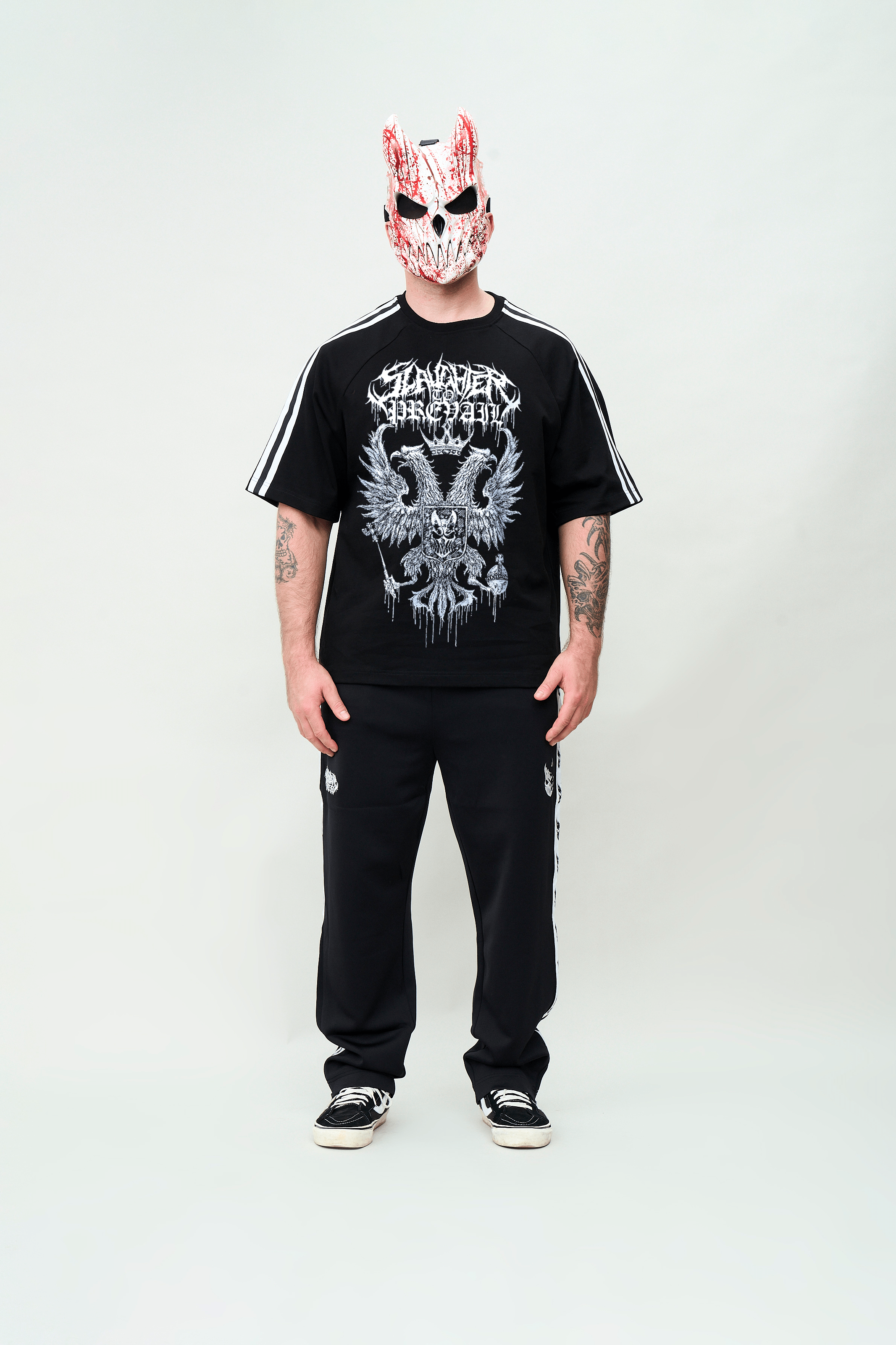 This premium tee plants the imperial seal of chaos right on your chest: a feral double-headed eagle, shattered crown, ritual scepter and orb, and a snarling mask at the heart of it all. Brutal. Unmistakably Slaughter to Prevail.