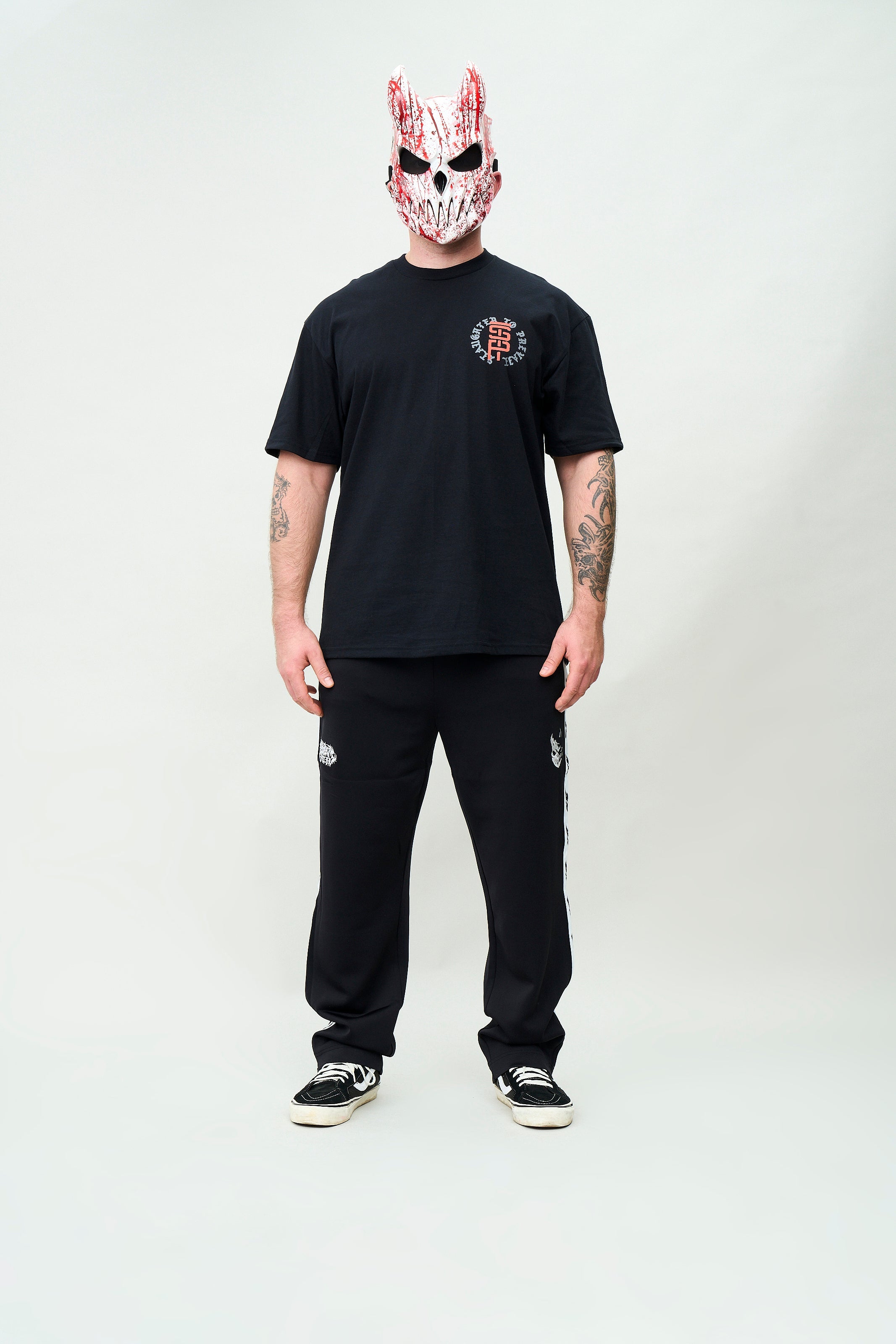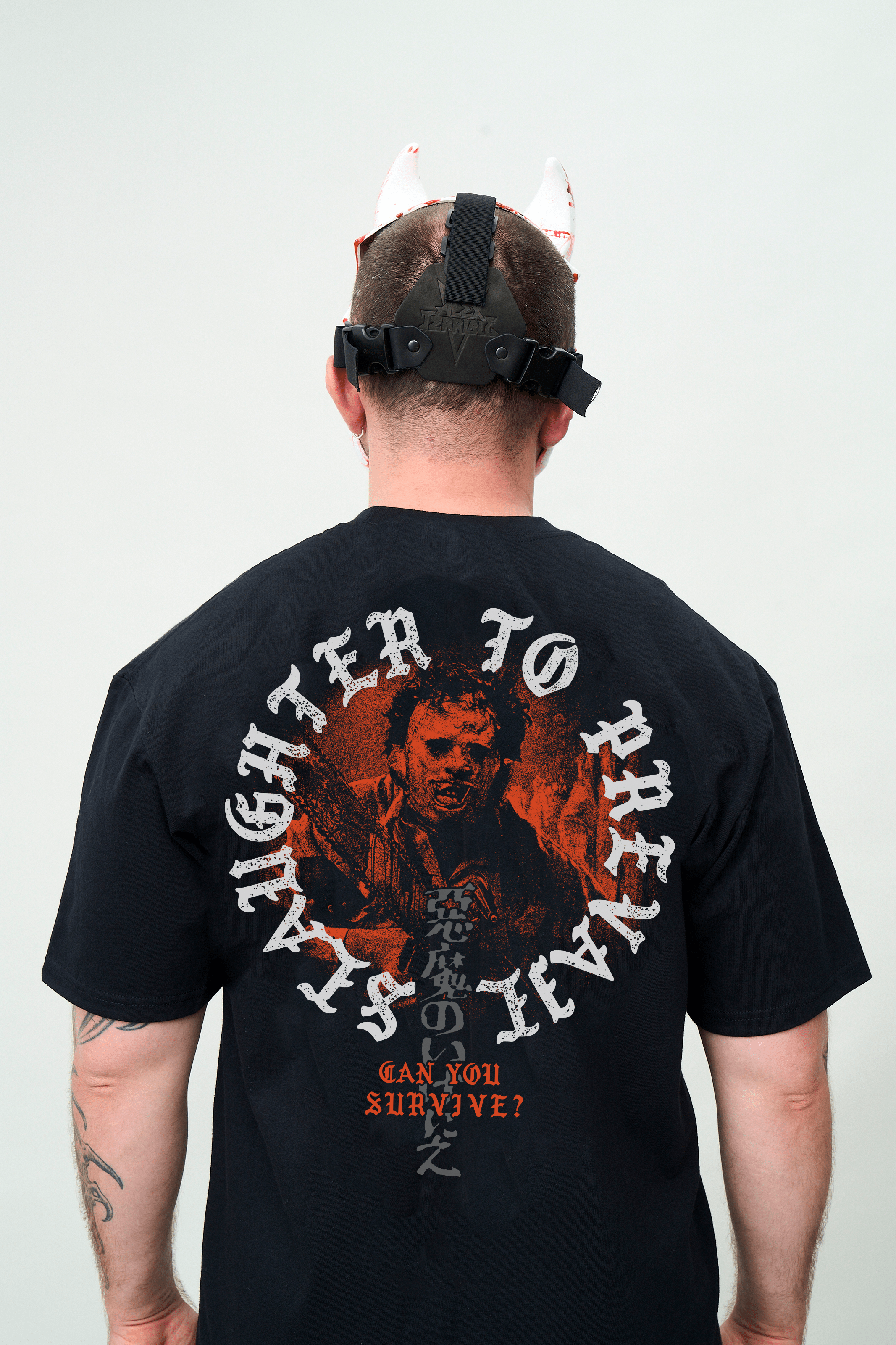 A fire-lit slasher centerpiece explodes across the back, ringed with SLAUGHTER TO PREVAIL lettering and punctuated by vertical Japanese script and the challenge: CAN YOU SURVIVE? Up front, a tight left-chest crest—STP monogram framed in a circular mark—keeps it lethal but clean.