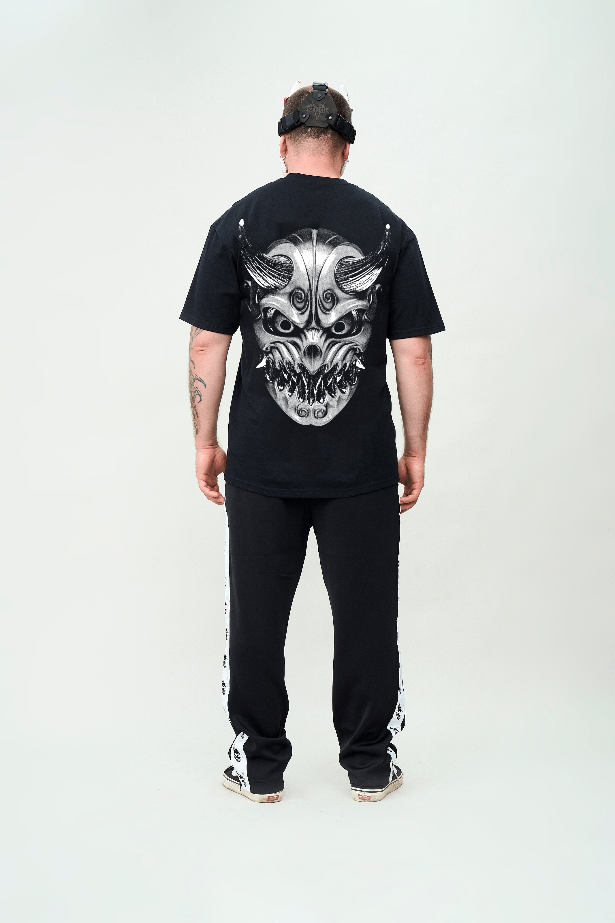 Full-back demon mask artwork in white