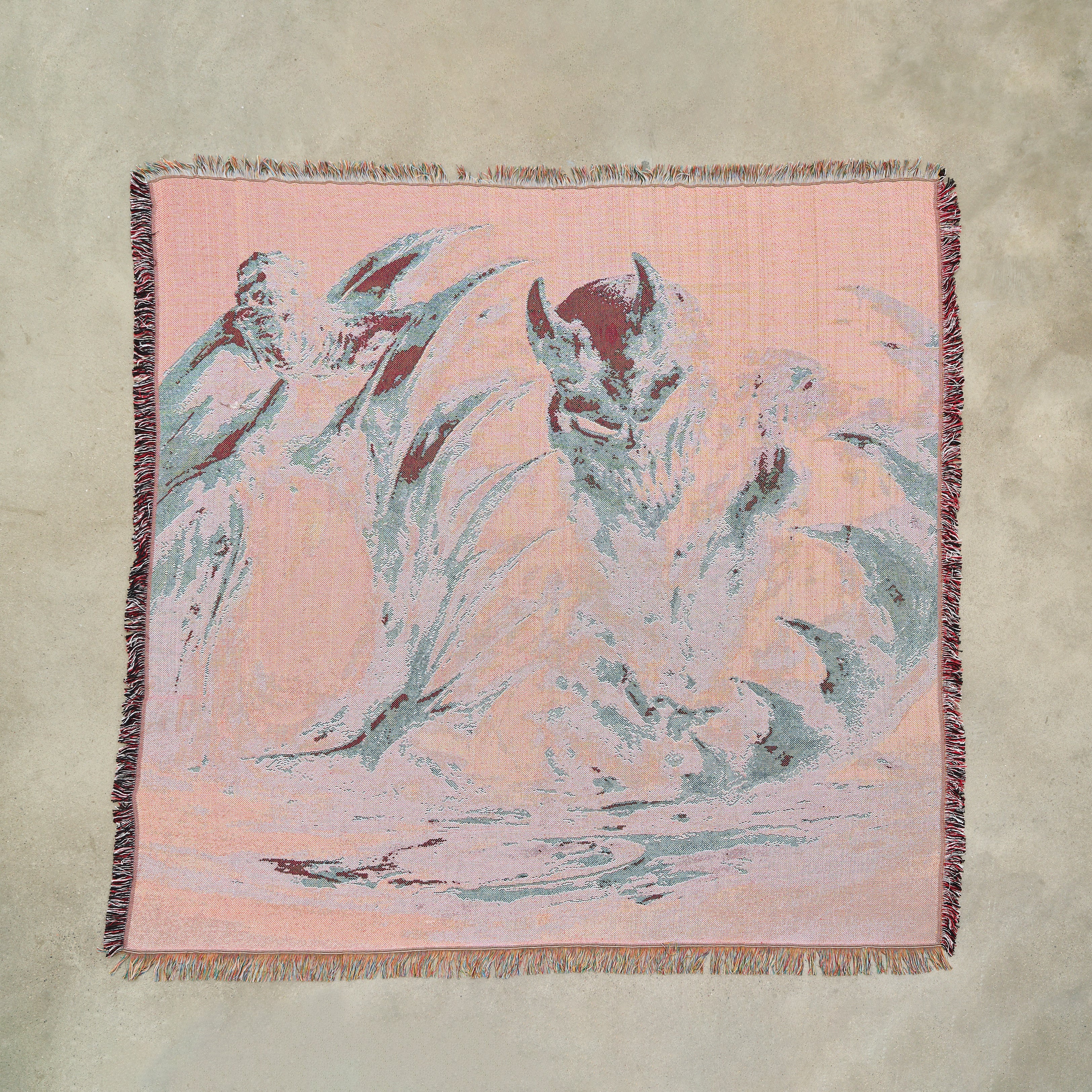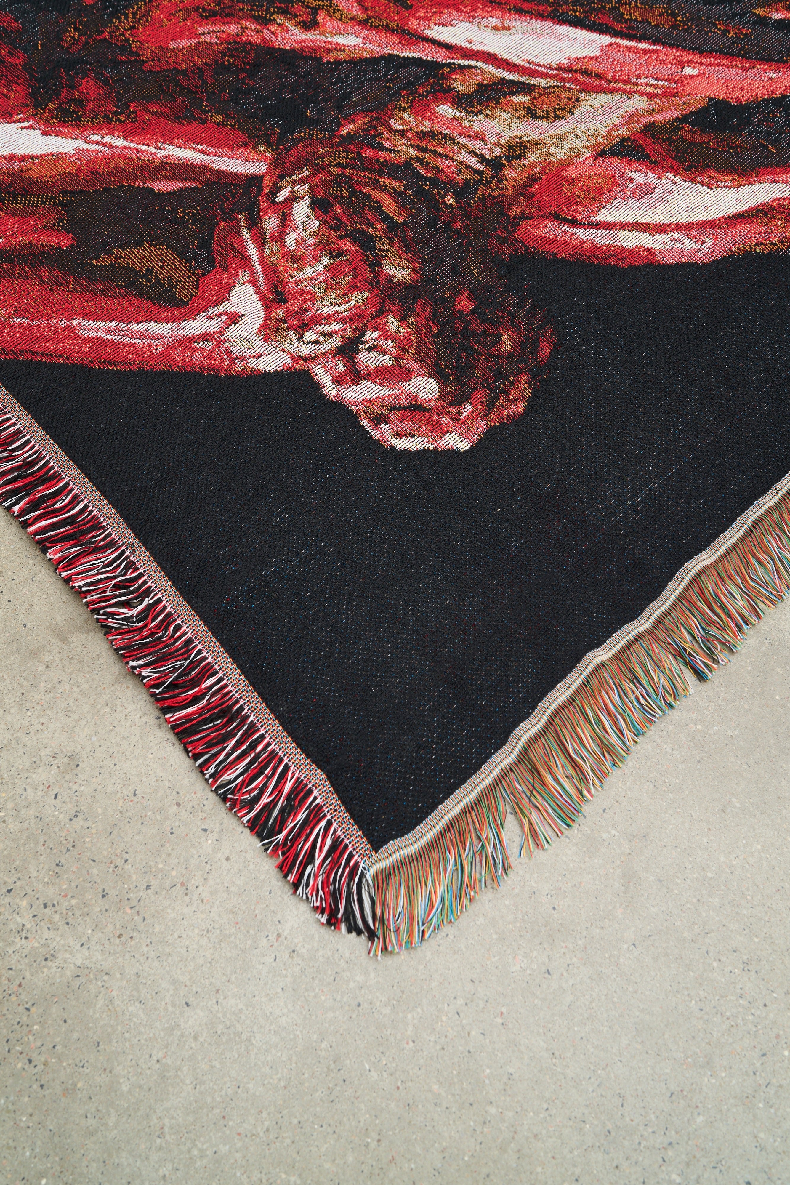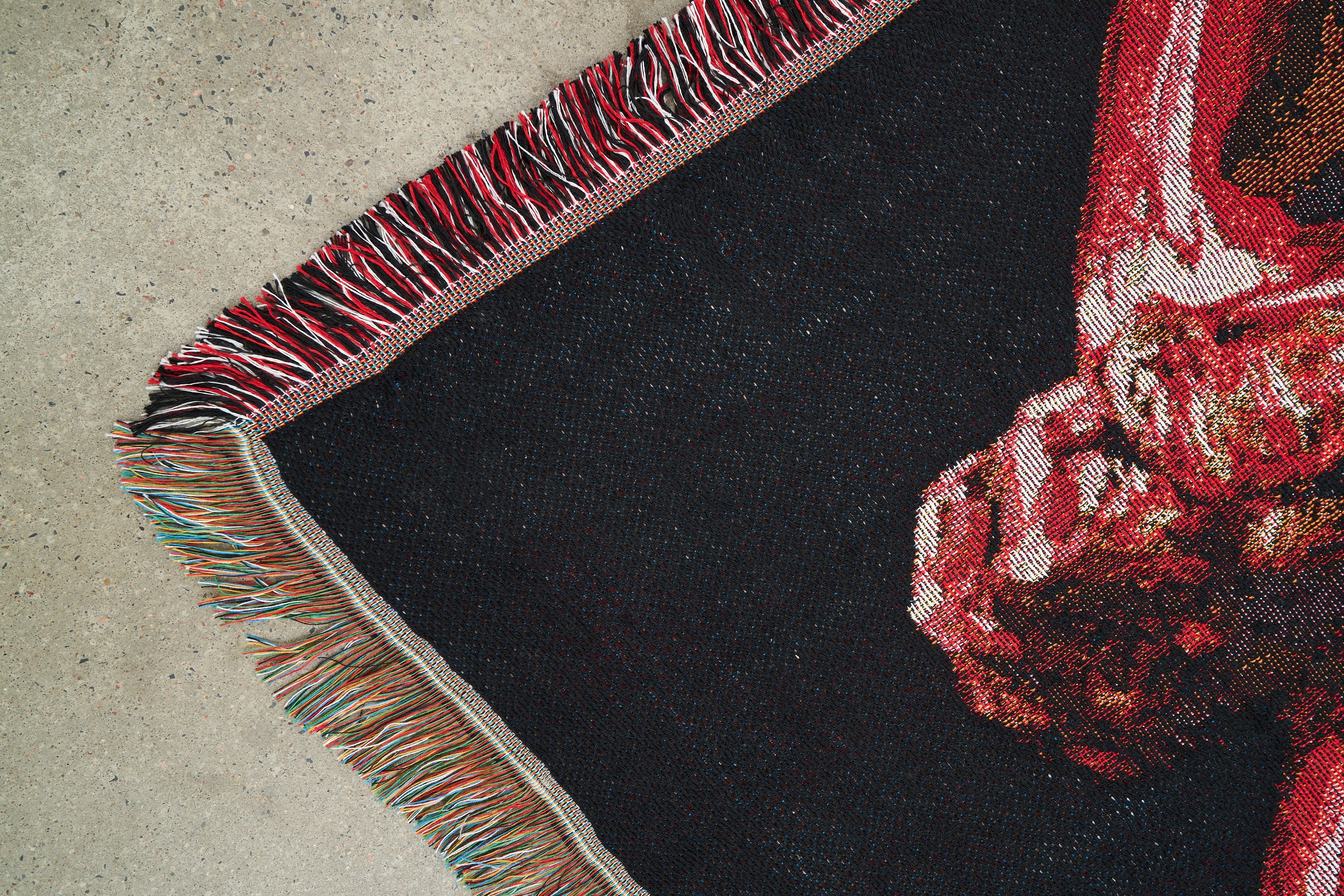 Woven with precision, not printed—this textured tapestry brings depth and intensity with every thread. Finished with multicolor fringe all around for that final brutal touch.