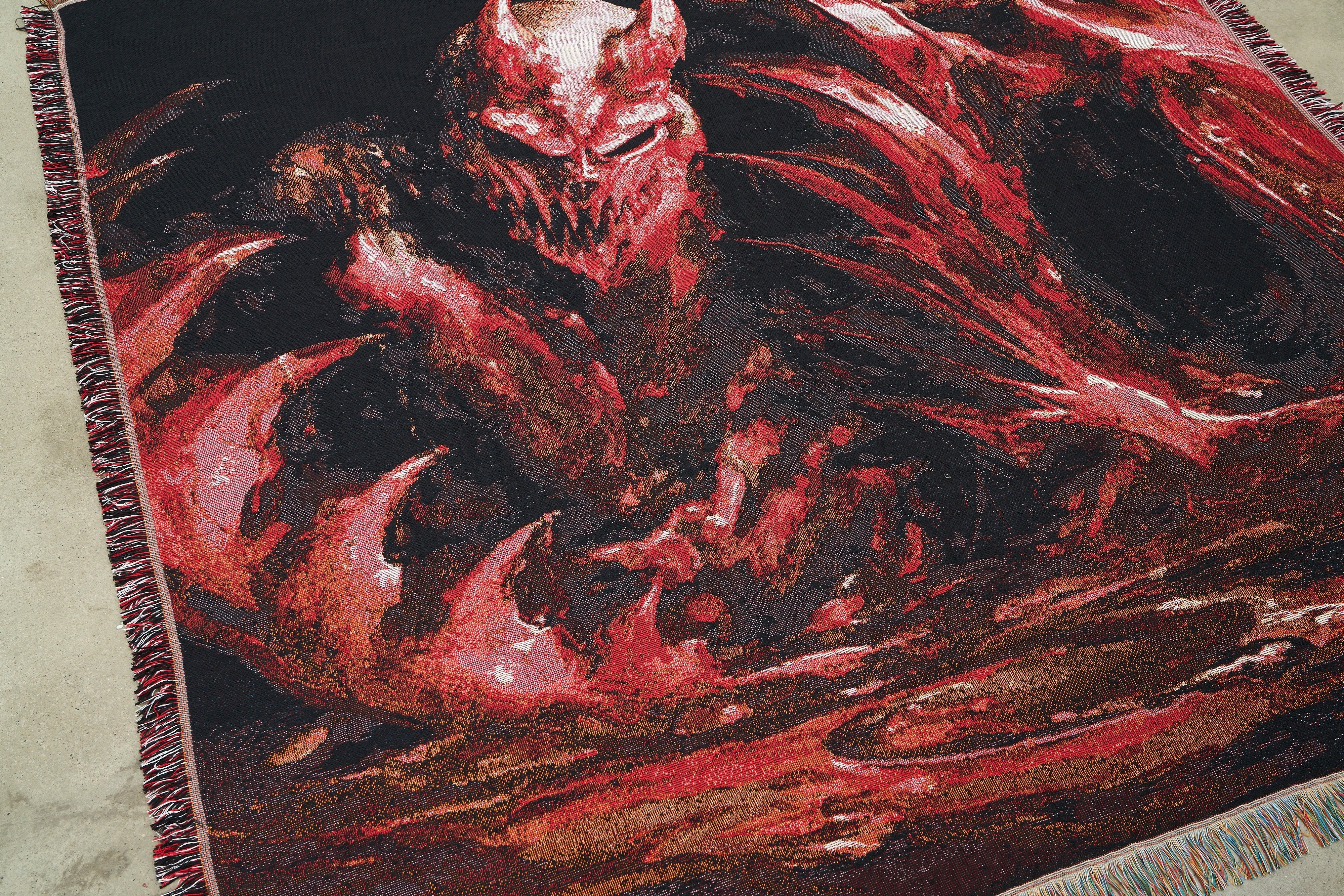Turn your space into a warzone. This heavyweight tapestry features a savage demon rising from a pool of blood—fully drenched in wrath and raw power. A statement piece for any room that needs chaos on the walls.